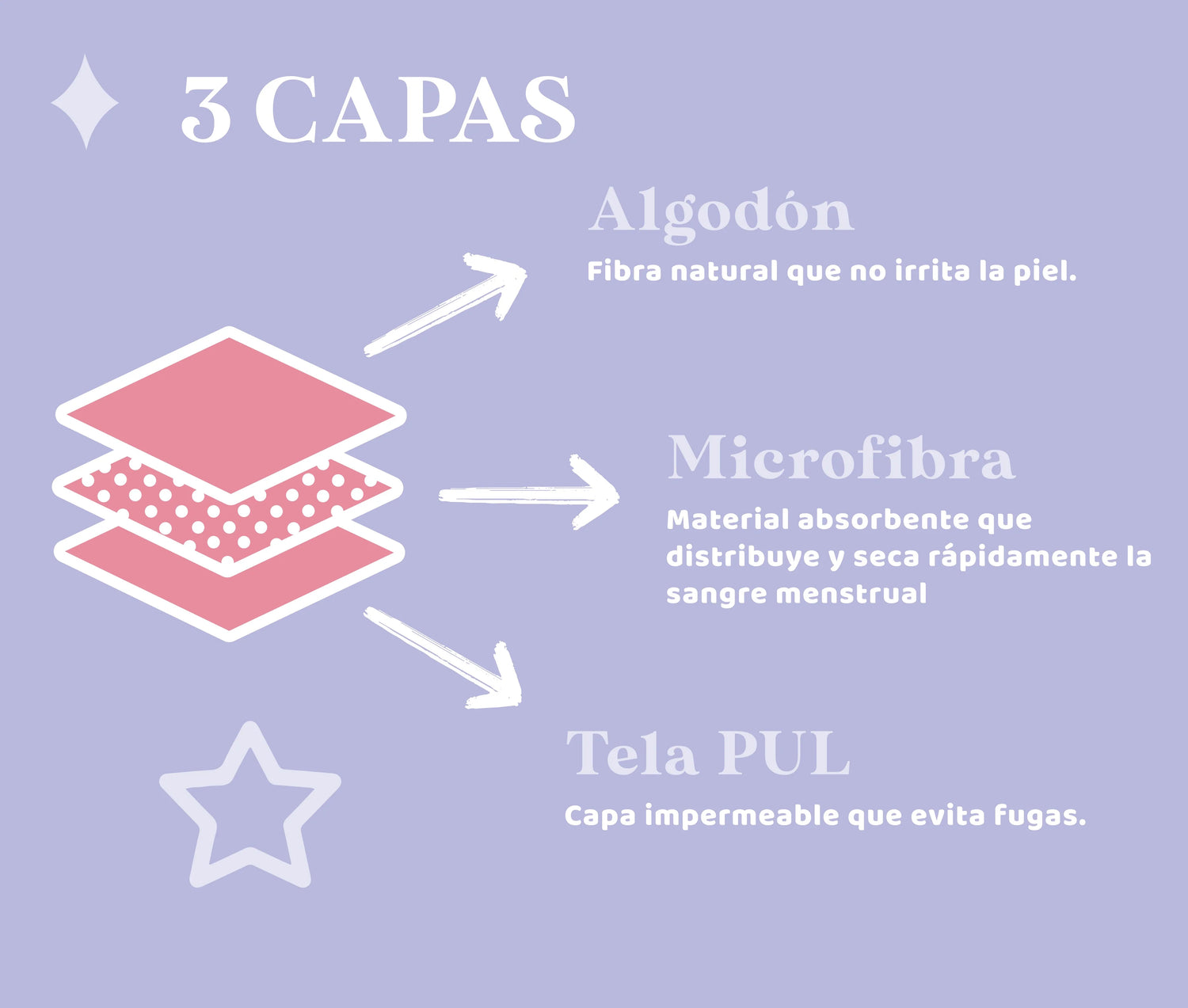 Sí, nuestros calzones cuentan con 3 capas protectoras. La primera es una capa de algodón, fibra natural que no irrita la piel. La segunda está compuesta de microfibra, material absorbente que distribuye y seca rápidamente la sangre menstrual. La tercera es tela PUL, una capa impermeable que evita fugas. Además, estas capas con antibacterianas y antioloras.